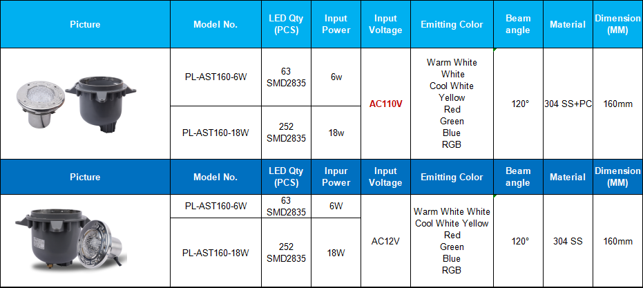 Specification Of POOLUX 160mm SMD2835 IP68 Waterproof LED Underwater Swimming Pool Lights