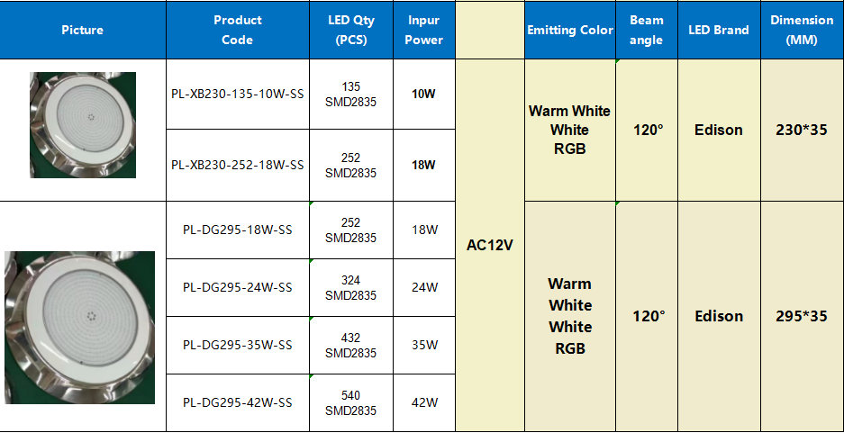 Specification Of POOLUX IP68 Waterproof 230mm Stainless Steel LED Wall Mounted Underwater Pool Light