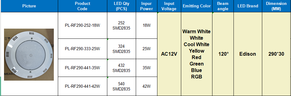 Specification Of POOLUX AC12V 290mm PC LED Swimming Pool Light Wall Mounted Underwater Pool Light